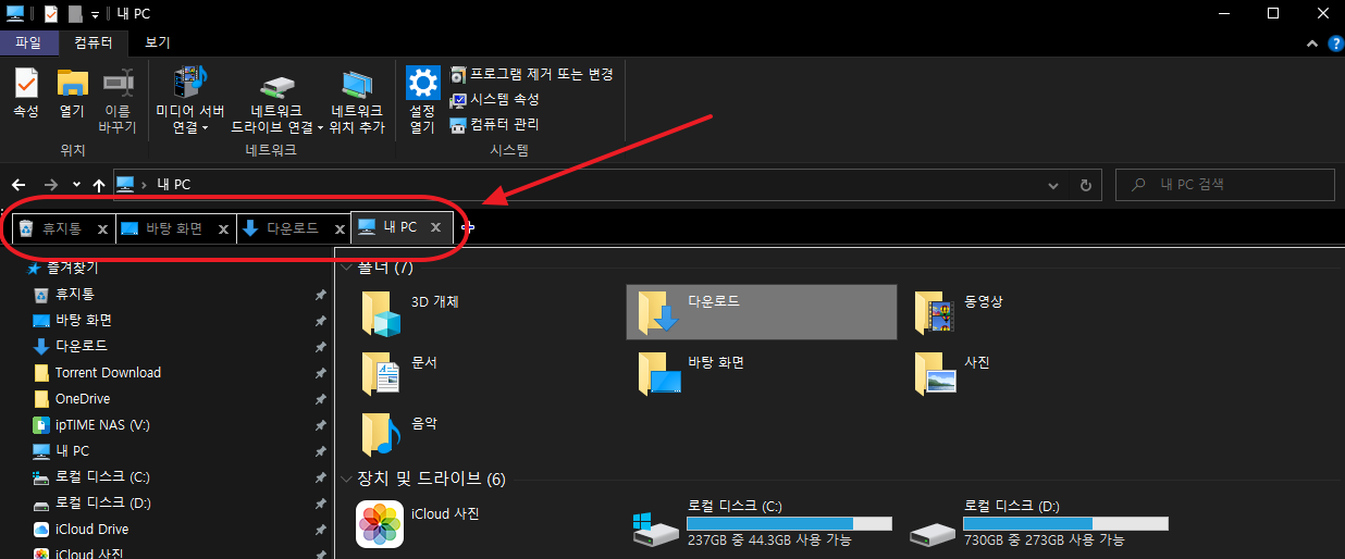 해당 프로그램을 설치하는 가잔 기본적인 이유는 바로 다음 이미지와 같이 탐색기 하나에서 탭을 사용할 수 있는 기능 때문이죠!