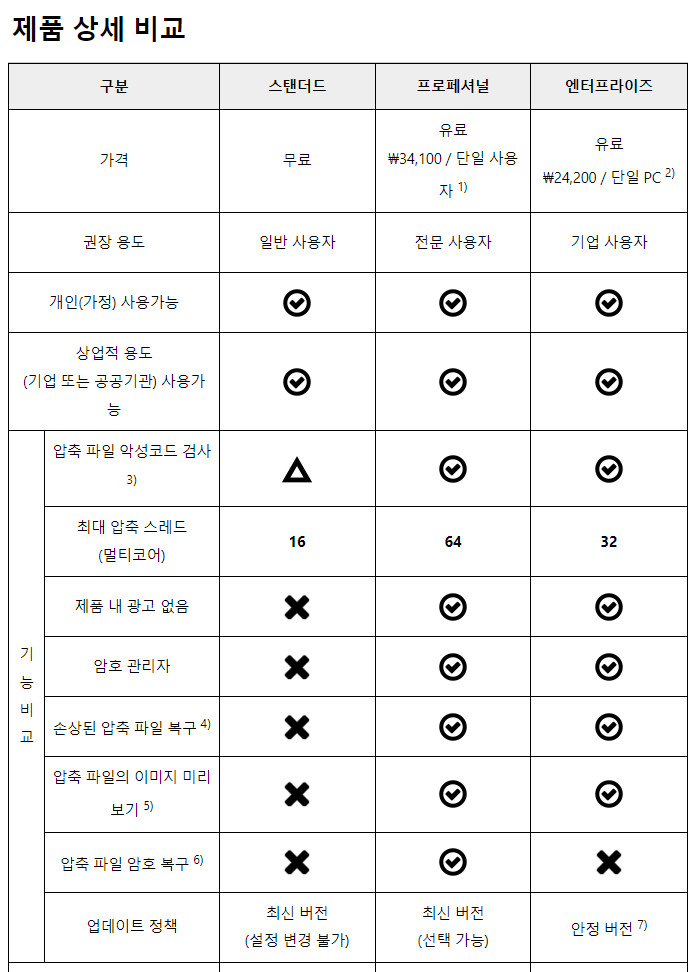 물론 다양한 기능들이 유료버전에 많이 있지만, 일반 사용자들에게는 기본기능으로도 충분해 보여요. 다음은 요금제에 따른 기능 차이니까 참고하시면 됩니당~