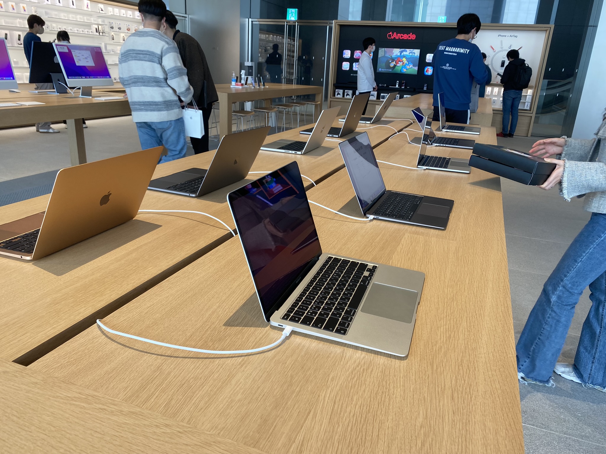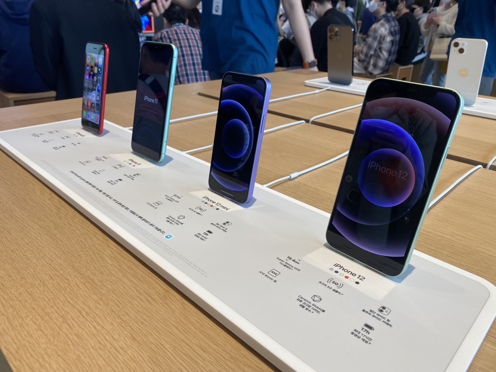 아이폰은 대표적인 애플의 플래그십 제품이죠. 저도 삼성폰을 사용하다가 애플로 넘어왔지만, 애플의 매력에 빠진 뒤로는 삼성은 가전밖에 사용하지 않고 있습니다. 우리나라 기업에게는 미안하지만, 애플만이 가지는 감성과 소프트웨어와의 일체감이 생태계에서 더욱 빠져나가지 못하게 만드는 것 같아요. 애플 명동점 안의 제품들을 보고 있노라면, 제품들을 판다기보다 소비자에게 가지런히 정렬된 미술품을 자연스레 소개하는 것 같습니다. 아이폰의 케이블들의 배치는 기괴스러울 정도로 반듯하게 열을 맞춰놓았는데, 맥북의 케이블은 왜 저렇게 막 해놓았을까 하는 의구심도 드네요.😅