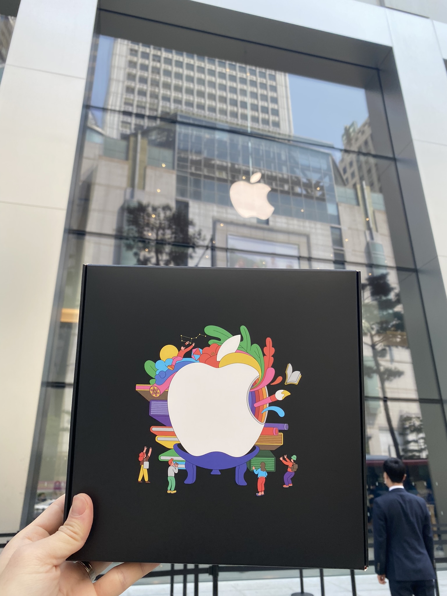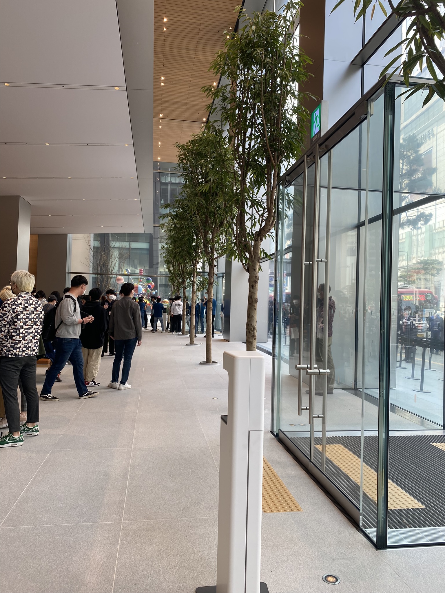 을지로입구역 6번출구로 나와서 1분 정도 걸으면, 애플 명동점이 바로 보이더라구요. 예약한 시간보다 30분 정도 일찍 도착했는데, 이미 줄선 사람들이 한가득이어서 당황했습니다. 일찍 들어가려고 하니, 외부에서 통제하시던 애플 직원분이 예약한 시간에만 입장이 가능하다고 해서 근처 스타벅스에서 시간 좀 때우다가 입장했습니다. 30분 지나서 가보니 사람이 더 많아진 느낌...🙄 그래두 예약시간에 맞춰 가니 앞으로 안내해주더라구요.