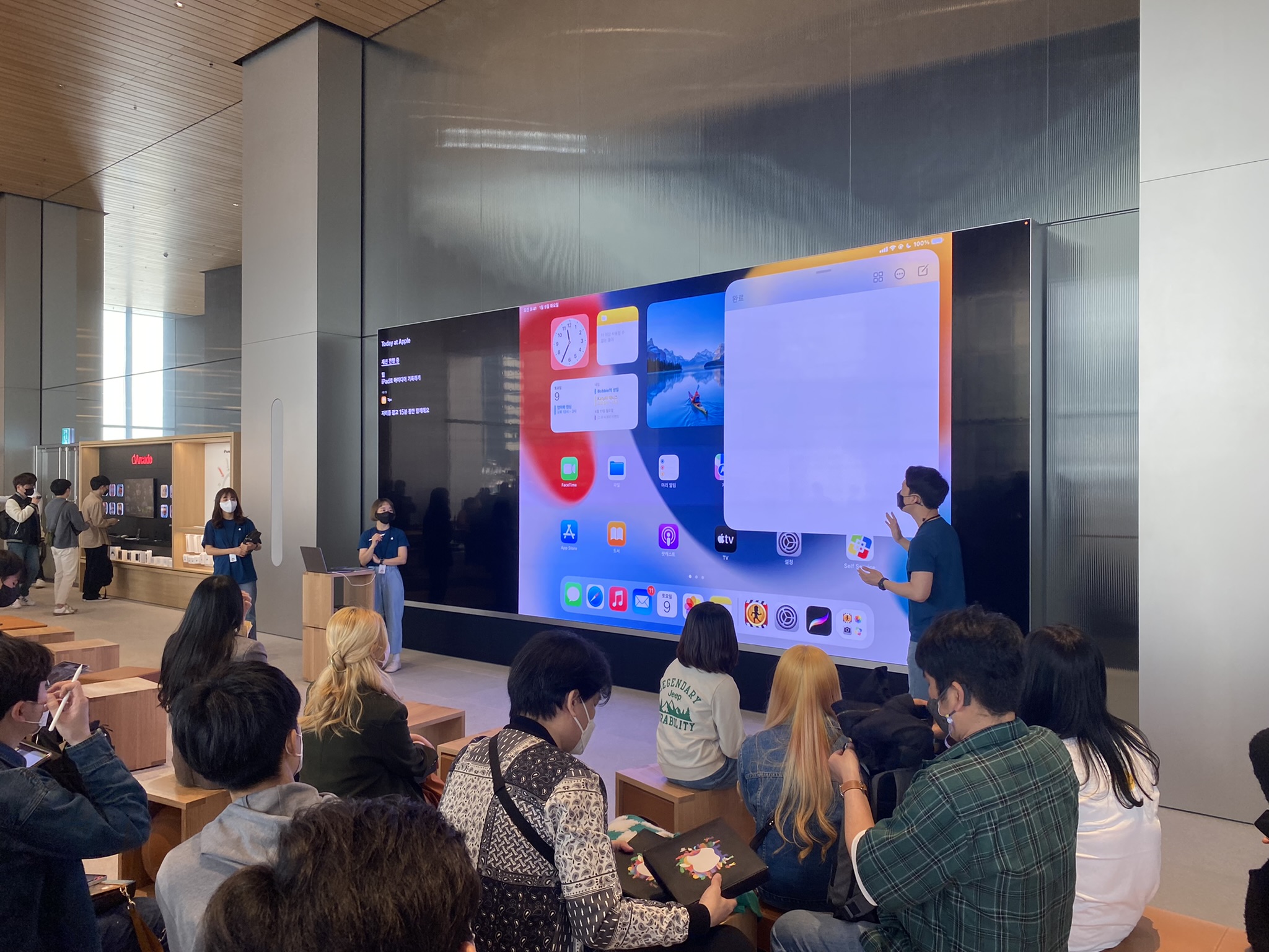 오픈 첫날 막 입장했을 때 제일 놀라웠던 건, 문을 열자마자 엄청난 소리의 환호성이 터지며 반겨주는 애플 직원분들이었어요. 와이프와 함께 입장하면서 엄청난 환대를 받는 느낌이라, MBTI가 I인 저로서는 약간 부담스럽긴 했지만 기분은 좋았어요😃. 처음으로 입장하자마자 자연스럽게 저희를 2층으로 안내했는데, 많은 사람들이 대형화면 앞에 앉아 애플 직원분의프레젠테이션을 보고들 계시더군요. 잠깐 PT를 보다 보니 메모앱에 저렇게 다양한 기능들이 있는지 처음 알았습니다.ㅎㅎ
