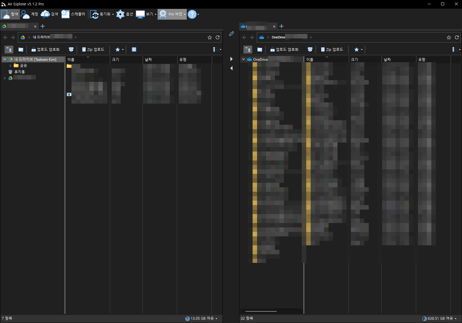 위의 이미지는 에어익스플로러의 작업화면이다. 윈도우 드라이브에서 파일을 관리하면 상당히 느린데, 이 프로그램을 이용하면 파일 이동이나 복사 속도가 상당히 빠르다. 가운데에 위치한 화살표를 이용하여 파일을 복사할 수 있다. 나는 프로버전을 이용하고 있지만, 굳이 프로버전을 사용할 필요가 없는 게, 클라우드를 세 개 이상 쓰는 경우가 없기 때문에 기본 플랜만 이용해도 충분히 이용가치가 있다.